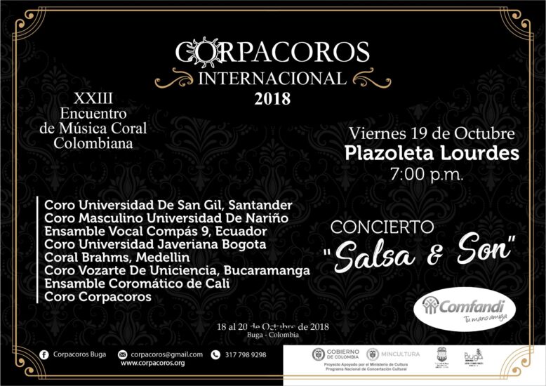 Con un concierto que se ha denominado Concierto "Salsa & Son"arranca este Viernes 19 de Octubre a partir de las 7:00 p.m. en la Plazoleta de Lourdes, contigua a la Basílica del Señor de los Milagros de Buga, el Vigésimo Tercer Encuentro de Música Coral Colombiana. Entre los coros que se han anunciado están en el evento de apertura: el Coro Universidad De San Gil, Santander, el Coro Masculino de la Universidad De Nariño, el Coro