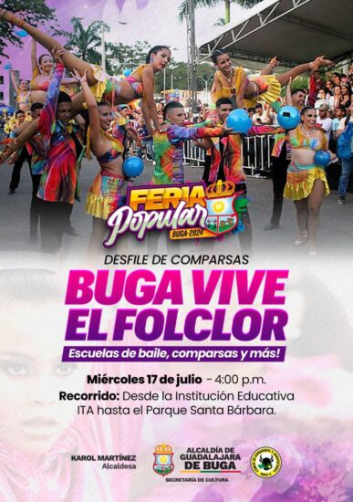 Hoy Miércoles 17 de Julio, se llevará a cabo a las 4:00pm hora colombiana, el desfile multi cultural "Buga Vive el Folclore" es un evento destacado dentro de la Feria de Buga, que celebra y promueve las tradiciones culturales y el talento artístico de la región. Esta festividad, parte integral de la Feria Exposición Nacional Agropecuaria de Buga No.71 "Verdaderamente Encantadora".