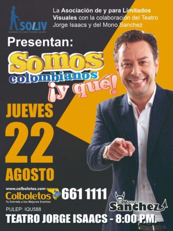 El reconocido humorista colombiano El Mono Sánchez se presenta en el Teatro Jorge Isaacs de Cali este próximo 22 de agosto a partir de las 8 de la noche, con el fin de recaudar fondos en favor de la Asociación de Limitados Visuales.