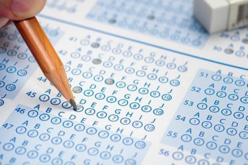 Imagen superior de hoja de respuestas con selección múltiple de cuestionario en examen.