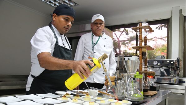 Imagen superior:Aprendiz del Centro de Comercio y Servicios, perteneciente al programa Técnico en Gastronomía y Mesa Bar,hace una demostración de su aprendizaje frente a instructores.Foto Sena.