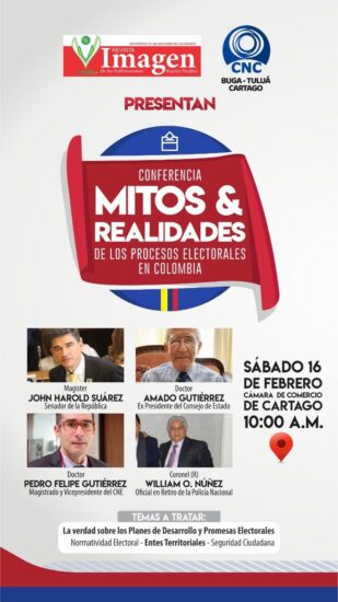 Es de esta manera que intentando aclarar vacíos y responder a varias de las dudas que se tienen sobre los procesos electorales en Colombia, la Revista Imagen De los Vallecaucanos Región Pacífico, como parte de las actividades de responsabilidad social que asume como una empresa del sector editorial y de los medios de comunicación y publicitarios, en alianza con los canales CNC de Guadalajara de Buga, Cartago y Tuluá, con el apoyo de la Cámara de Comercio de Tuluá, invita a la conferencia “Mitos y Realidades” de los Procesos electorales en Colombia, la cual tiene cumplimiento el sábado 16 de febrero de 2019 a partir de las 10 de la mañana, en el auditorio de la Cámara de Comercio de Cartago, ubicado en la en la Carrera 4 No 12-101.