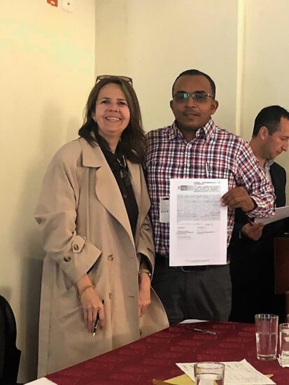 En la fotografía la Secretaria General del Ministerio del Interior Luz Helena Perdigón Mejía, protocoliza el compromiso del Gobierno Nacional con la realización de la obra,a su lado Ciro Grajales Director Administrativo de la Alcaldía de Guacarí, en representación del Alcalde Gerardo Salcedo.