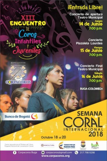 Con la participación de varias agrupaciones corales venidas de diferentes lugares del pais se inaugura este jueves 14 de junio en Guadalajara de Buga el XIII Encuentro de Coros Infantiles y Juveniles .